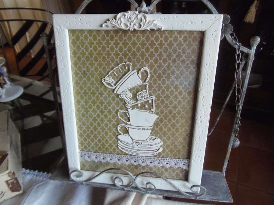 Hice un delantal y este cuadrito,qué lleva la planti en relieve sobre el cristal,me ha gustado mucho el resultado,el marco era uno de tantos qué tenía esperando su segunda oportunidad,pero con la filigrana de escayola de Lucía y María ha ganado mucho!