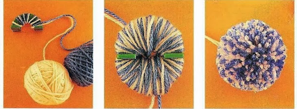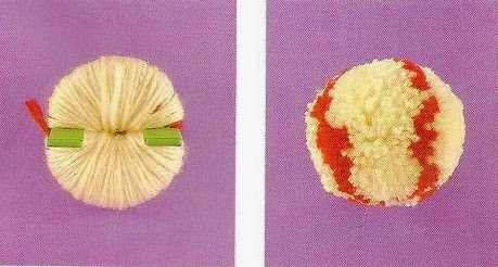 "Con esta variante se obtiene un pompón de dos colores, mitad de un color y mitad de otro. Es aconsejable combinar un mismo tipo de lana."