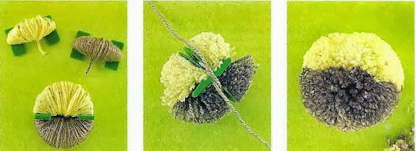 Hilados. Siempre es aconsejable realizar los pompones con lana de buena torsión y gruesa, ya que con las que se despeluzan o tienen componentes de seda, es muy dificil lograr que permanezcan tupidos.