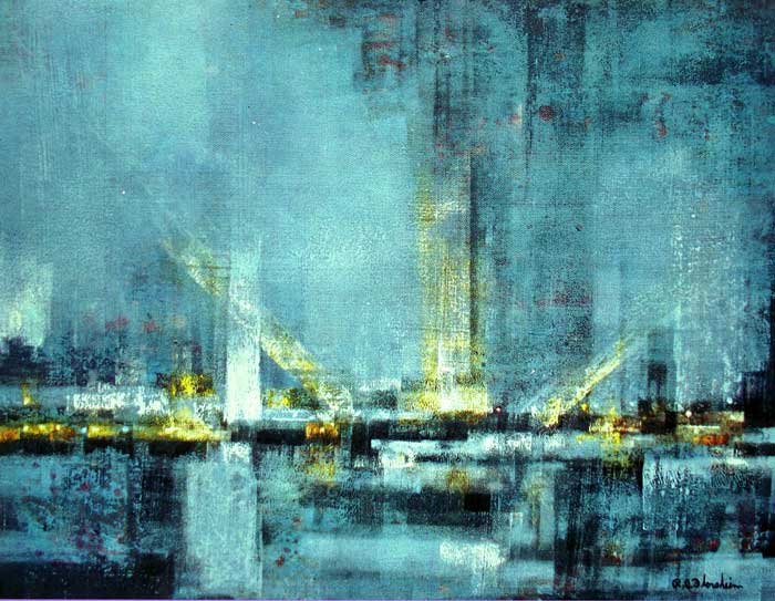 Iluminación de Richard Florsheim. En este lienzo con óleo se ha utilizado el tonking o raspado para quitar la pintura de ciertas zonas y suavizar las formas y los colores, con el fin de acentuar el aspecto desdibujado de la ciudad y sus reflejos nocturnos. Incluso en algunos puntos se aprecia el color blanco del soporte.Un ejemplo sencillo de Tonking (absorción)