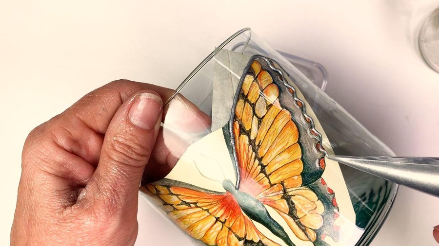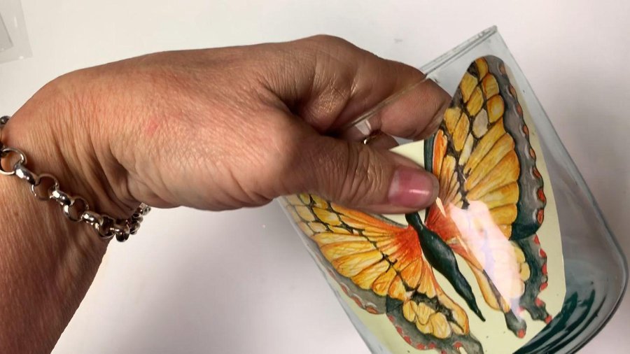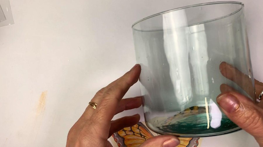 Partí de éste recipiente de vidrio y una imagen de mariposa.A este dibujo lo pego por el lado de adentro con cinta de papel para sujetarlo y que pueda trabajar con comodidad sin que se corra.