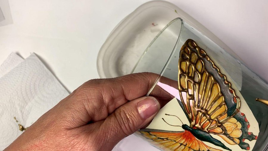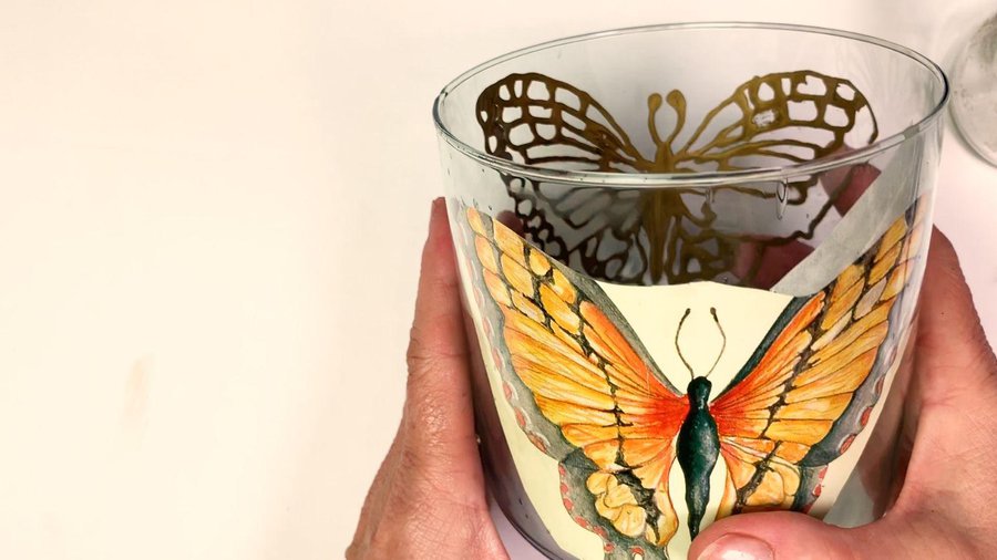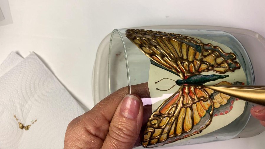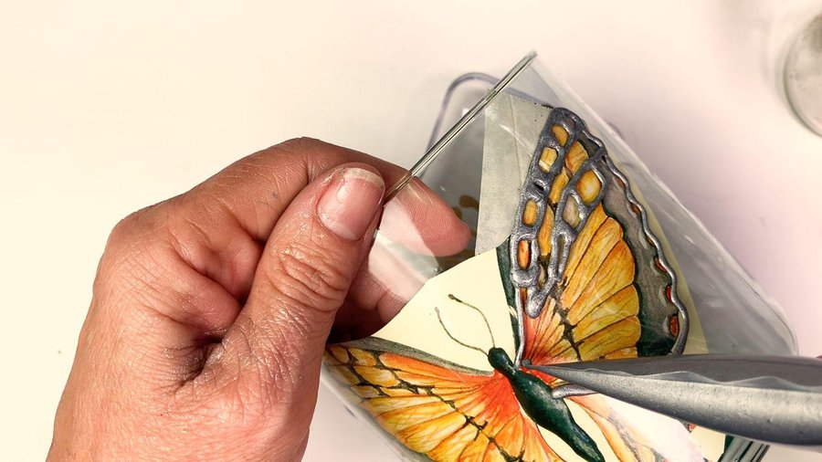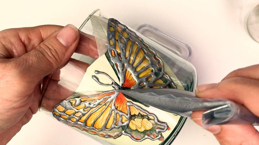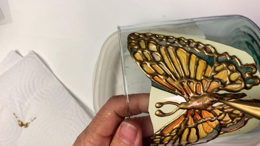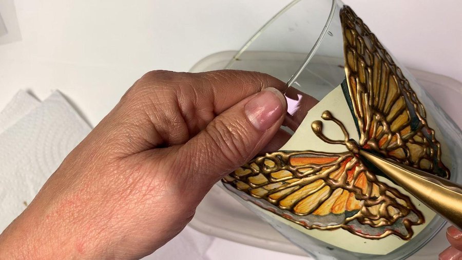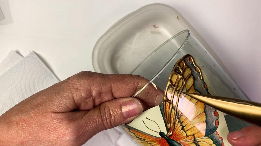 Cuando creo que la figura dorada esta lista giro el recipiente y ubico la mariposa del otro lado para delinearla ahora con pintura acrílica plateada también colocada dentro de la manga de repostería y de la misma forma que la mariposa anterior y voy a delinear solo algunas partes.