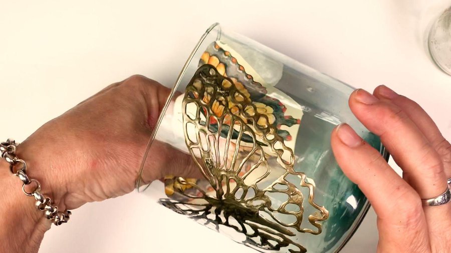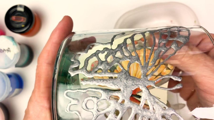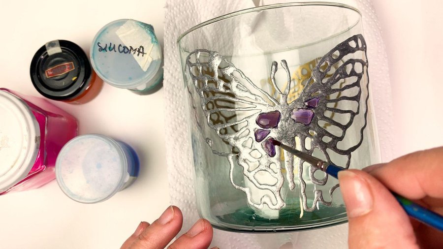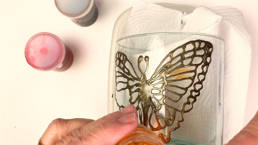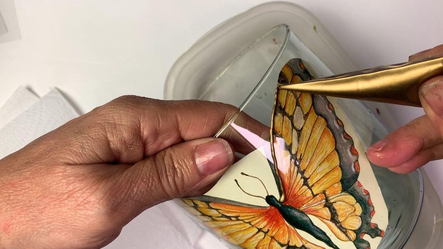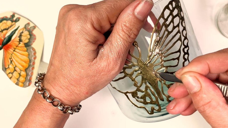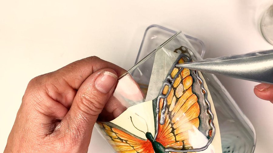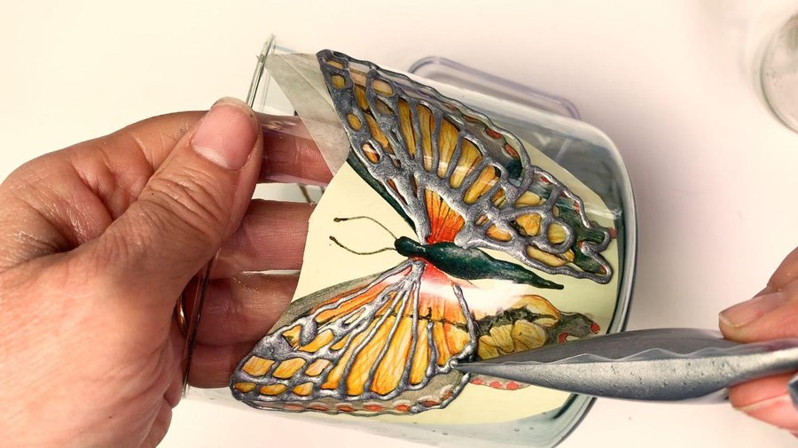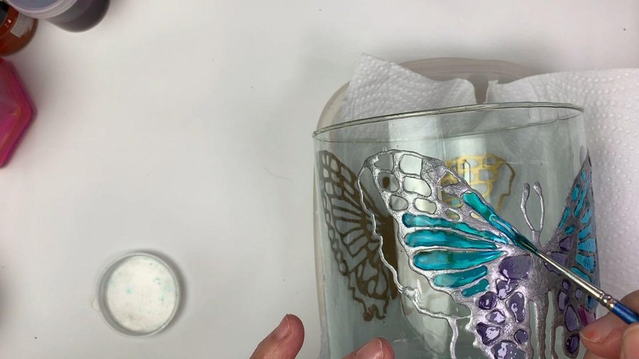 Cuando creo que la figura dorada esta lista giro el recipiente y ubico la mariposa del otro lado para delinearla ahora con pintura acrílica plateada también colocada dentro de la manga de repostería y de la misma forma que la mariposa anterior y voy a delinear solo algunas partes.