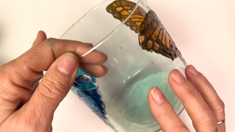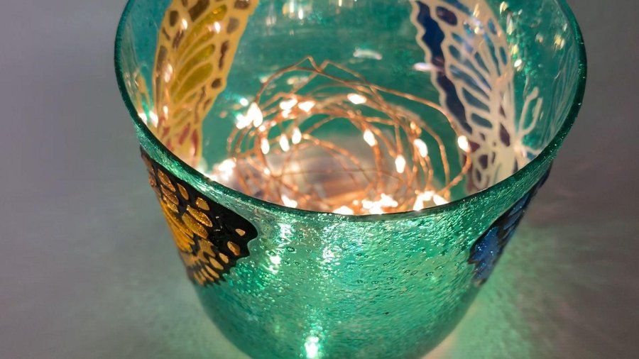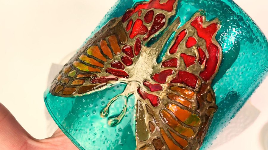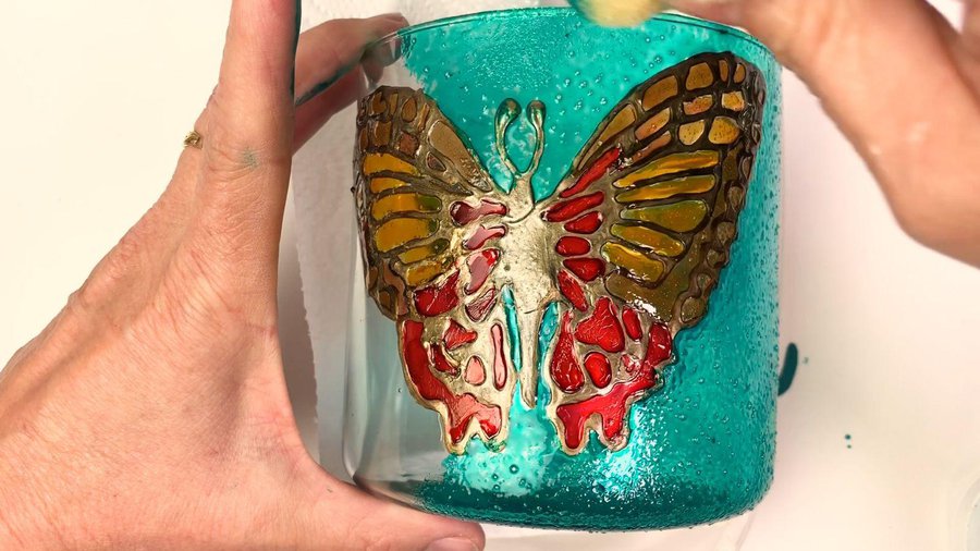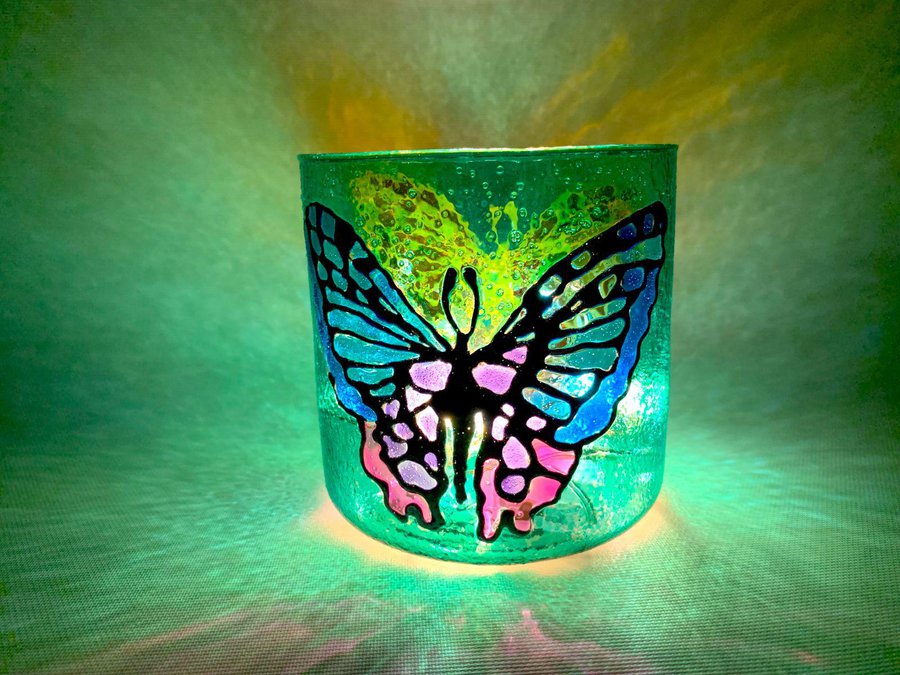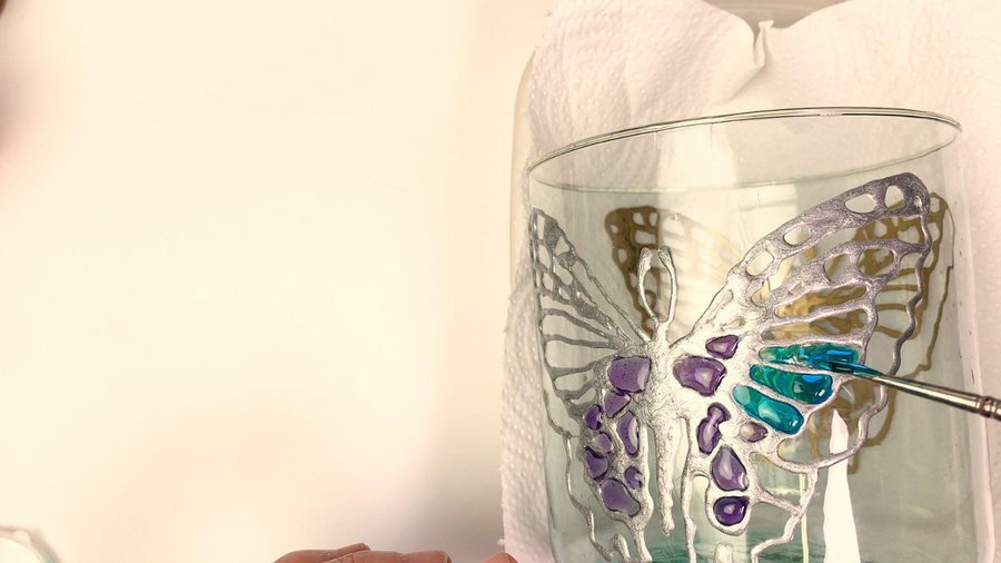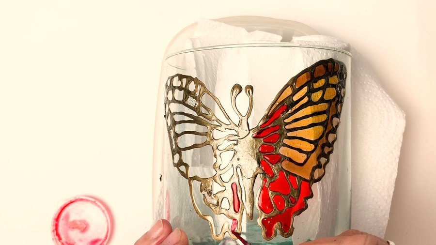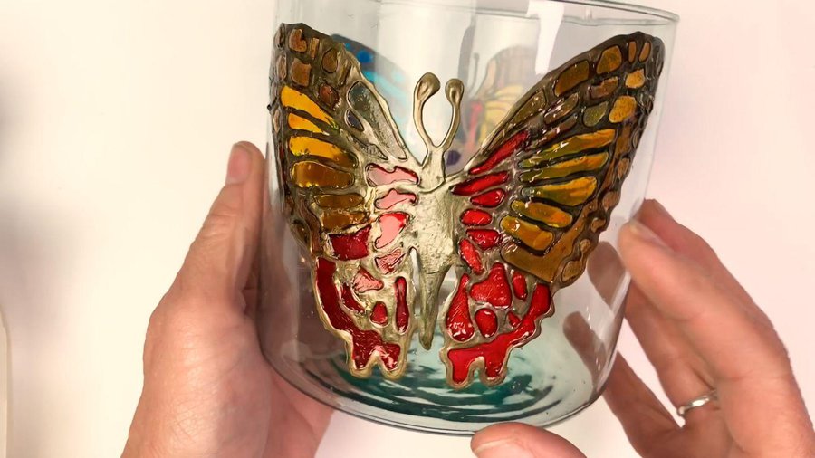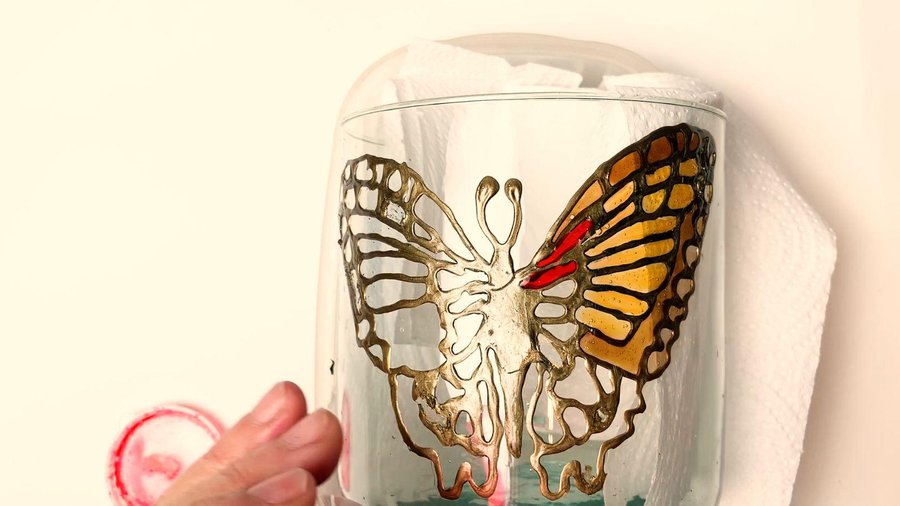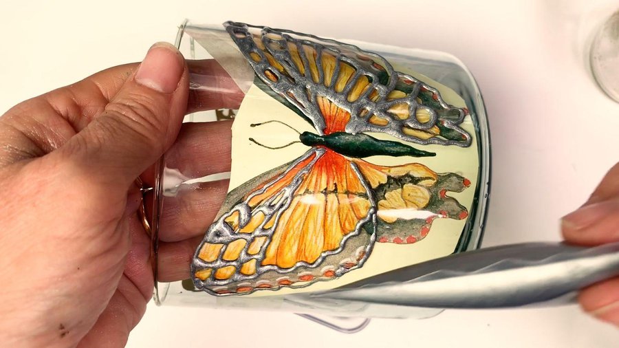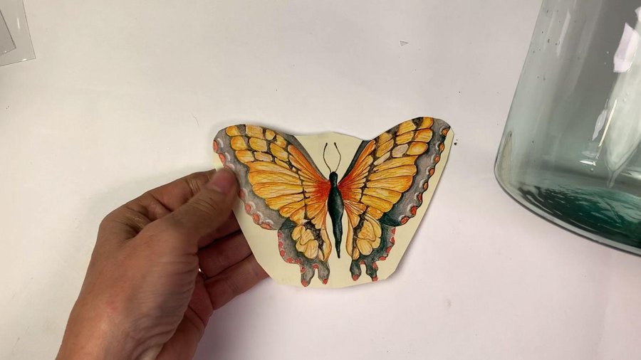 Recipiente de vidrioDibujo de Mariposa, cinta de papel