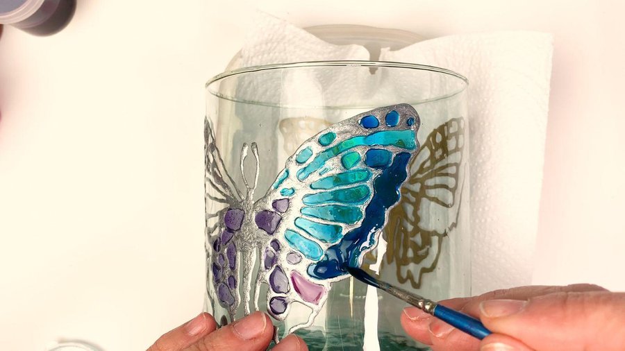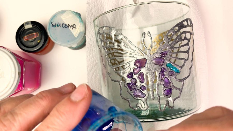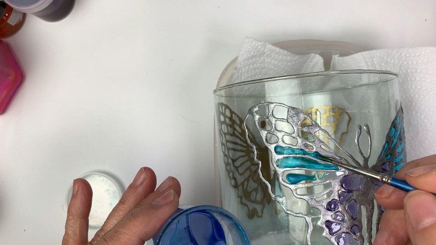 Si ustedes emplean las lacas vitrales comerciales tienen mejor adherencia y pueden pintar la pieza de una sola vez. Los colores que elegí para esta mariposa son celestes, azules y violetas.