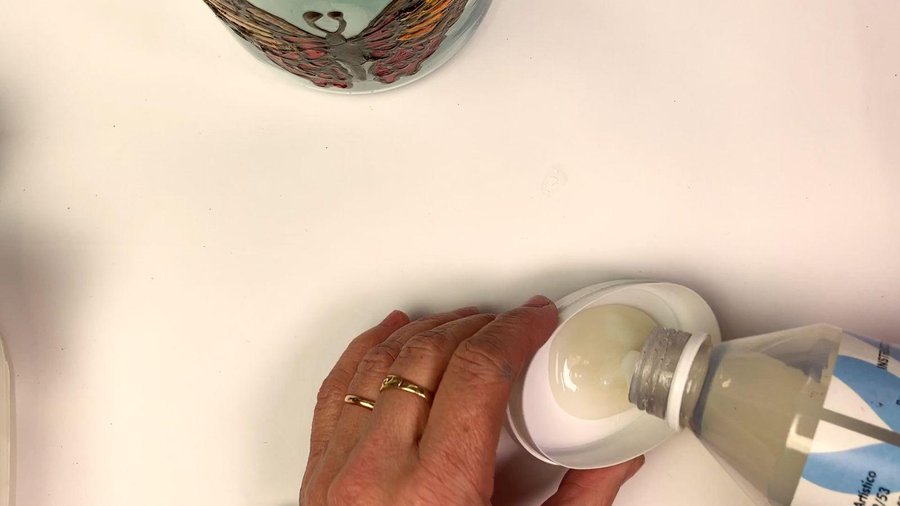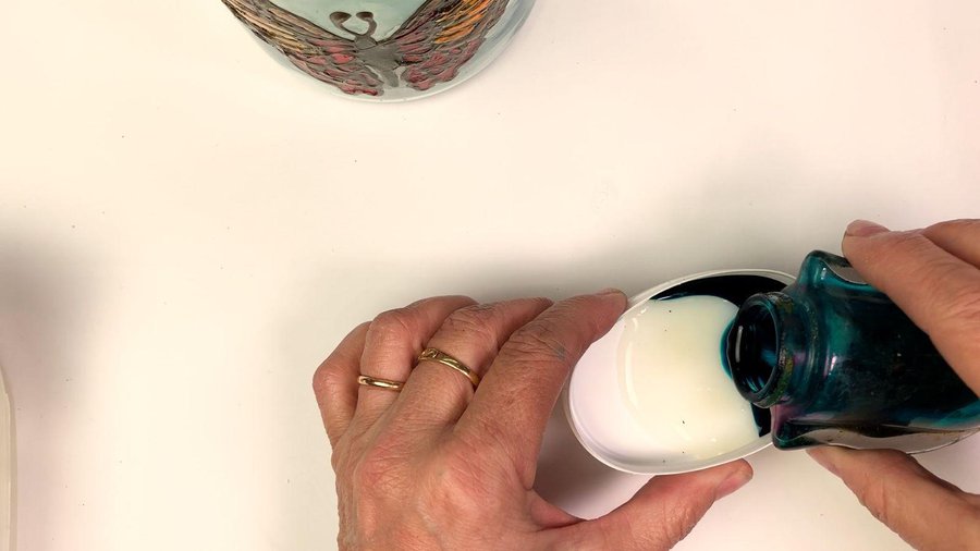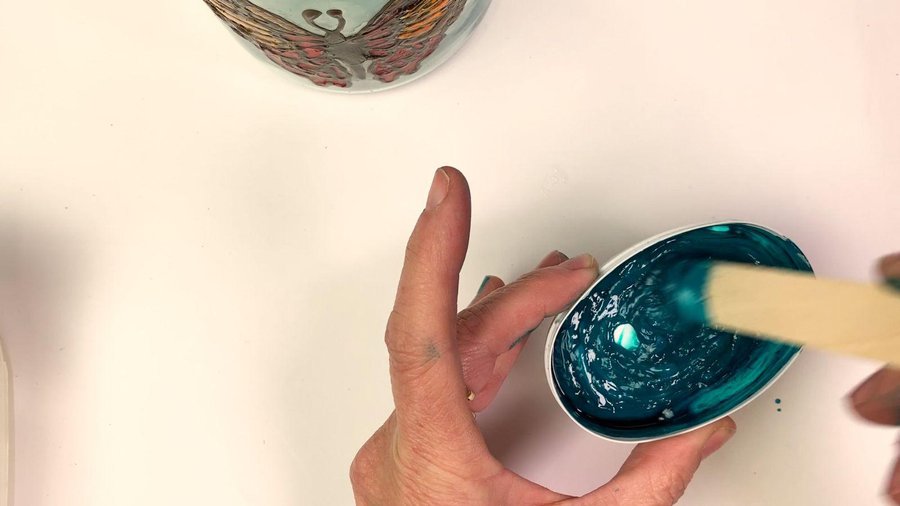Mi idea es cubrirla totalmente con 1 solo color. Coloco un poco de barniz dimensional al que le voy a agregar un poco de esta tinta al alcohol verde oscura.
