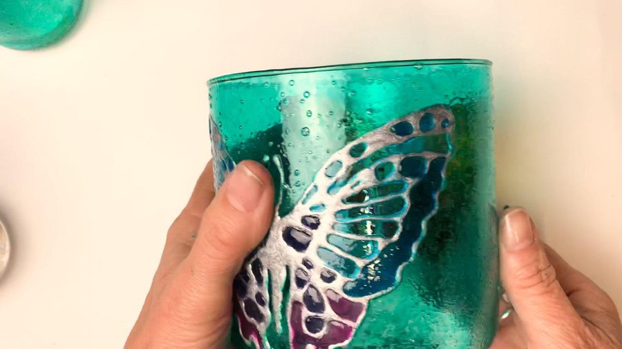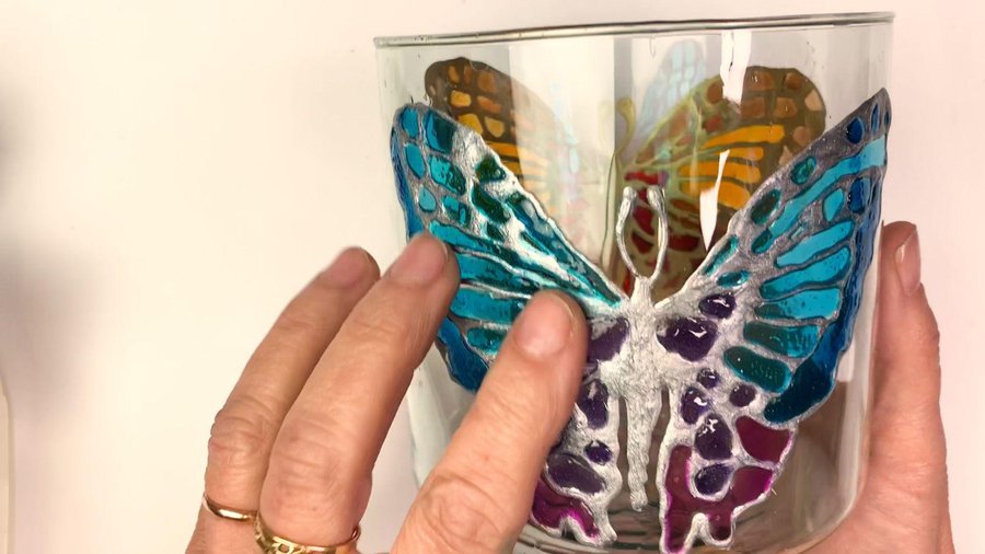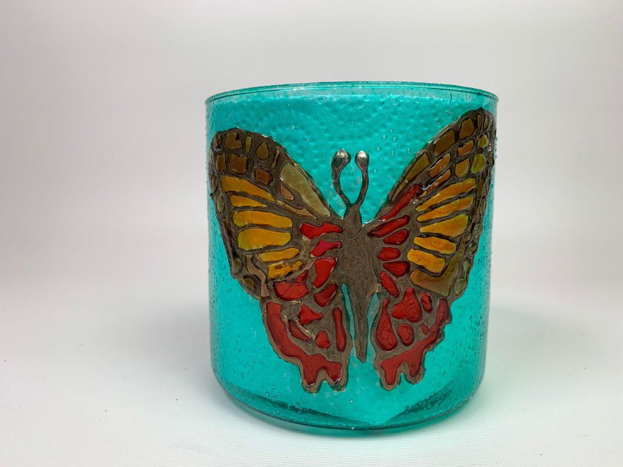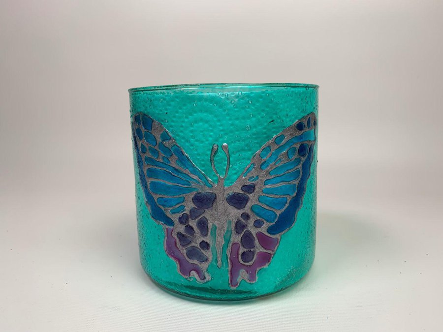 Yo elegí un recipiente de vidrio que puede tener muchísimos usos diferentes y me enfoqué a trabajar con una misma mariposa diferenciada por distintos colores.