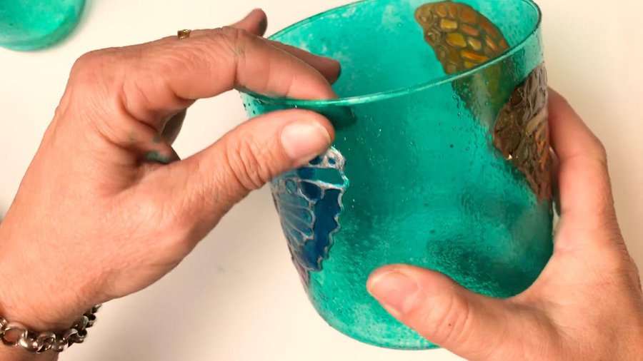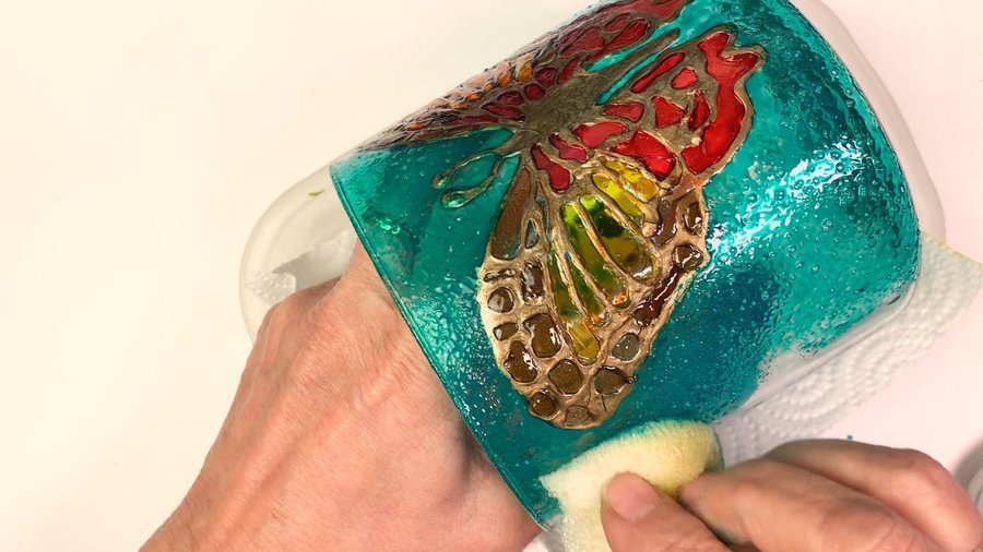 Luego con una esponja aplico sobre el resto del recipiente y permito que se formen algunas burbujas para que de un aspecto no parejo.