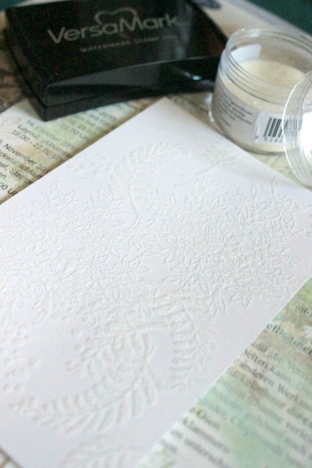* Estampas el motivo que desees con una tinta apta para "embossing" (para polvos de realce). Enseguida, sin dejar que se seque la tinta cubres con los polvos especiales para ésto.