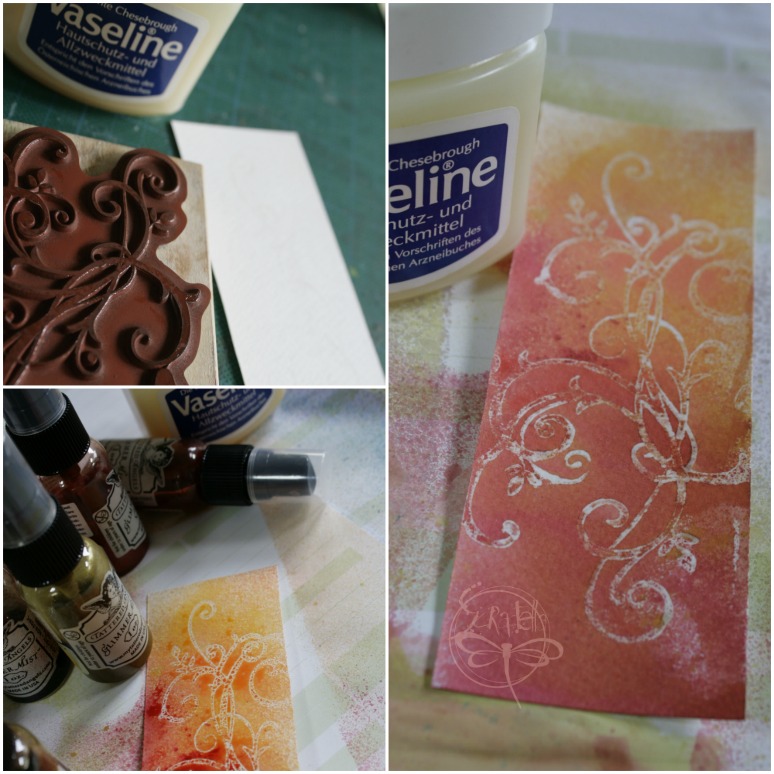 La vaselina la podemos poner con el dedo sobre el sello y luego estampamos. Lo mejor es usar color con atomizador para no ir a correr la vaselina. Los efectos que dá son muy bonitos.