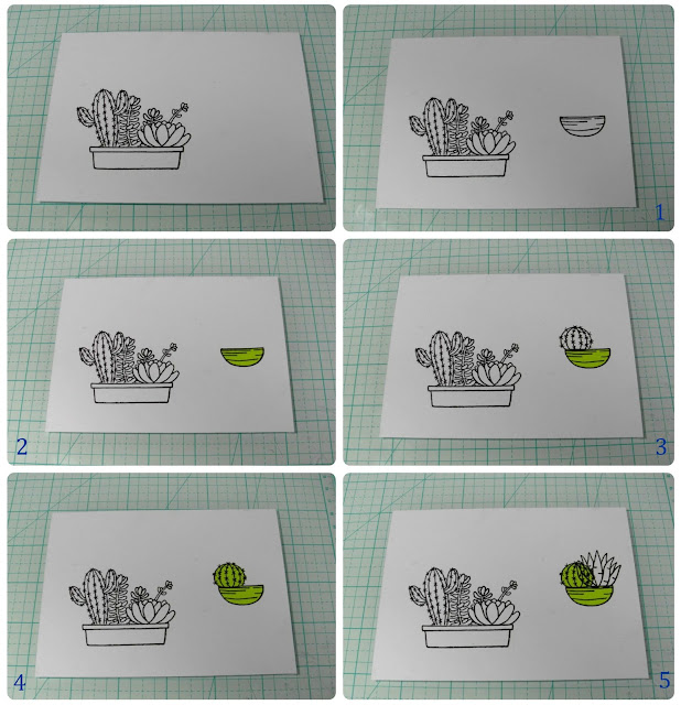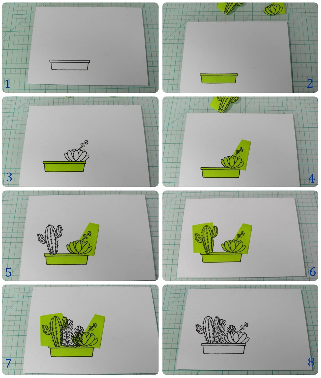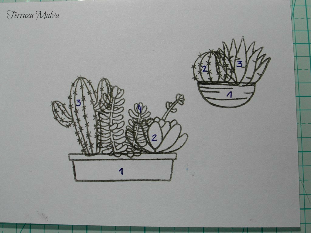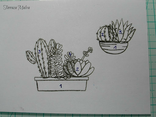 Yo he estampado en un papel corriente los sellos en la posición que quiero que se vean. Como habréis notado los sellos están impresos tal cual por lo que se solapan unos sobre otros y queda bastante feo y sin sensación de profundidad. Ahora hay que decidir el orden de estampado. El primer sello que estamparé serán las macetas. Le asigno pues el número 1. Después asigno números correlativos al resto de sellos de los cactus, de forma que los que estarán "delante" tienen números más bajos (se estamparán antes) y los que estarán "detrás" tienen los números más altos (se estamparán después). De esta manera se planifica bien el orden de estampado y de enmascarado.