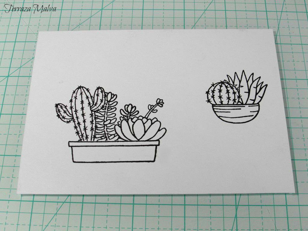 Estampo el último cactus en el centro. Este sello solapa tanto con los cactus de los lados como con la maceta.