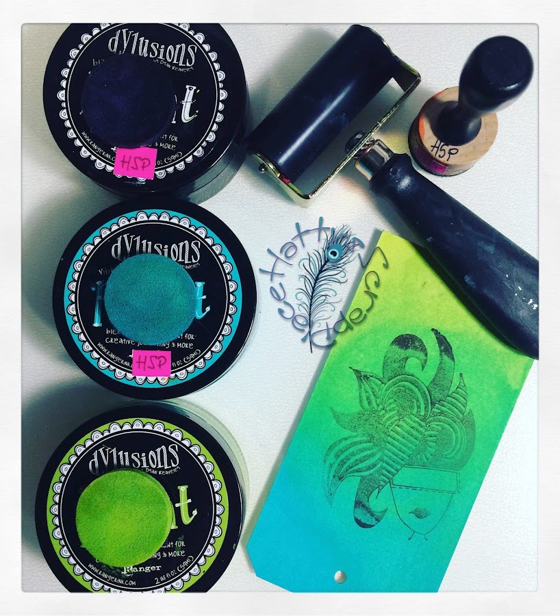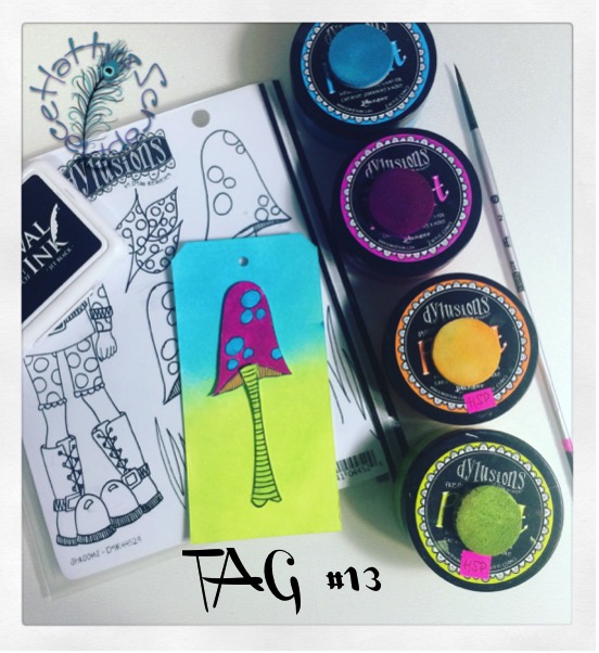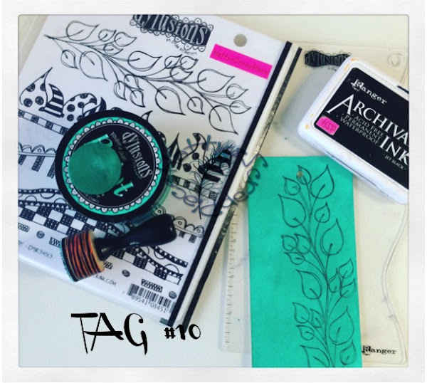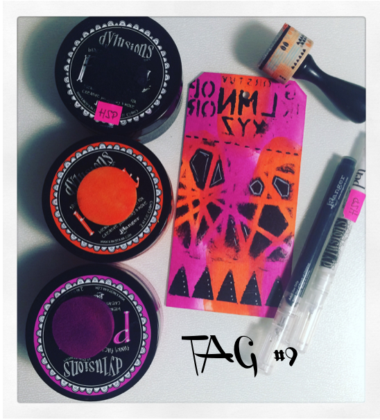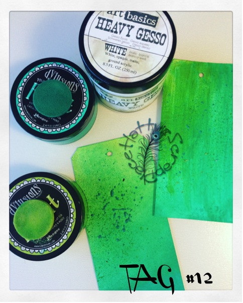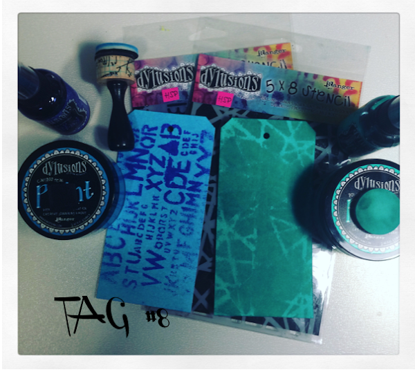 Para la técnica 8 usamos también las Dylusions Ink Spray, en uno de los tags pusimos una base de Dylusions Paint y sobre un stencil echamos el mismo color en Dylusions Ink Spray y en otro tag usamos una base clara de Paint y otra más oscura de Spray.
