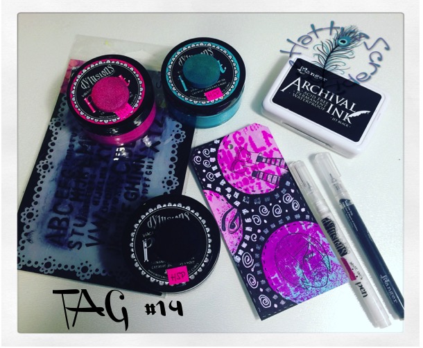 La otra técnica estrella ha sido la de crear un fondo con Paint, Ink Spray y stencil y cubrirla con Black Marble y con un stencil que nos permita ver el fondo, han salido unos tags chulísimos