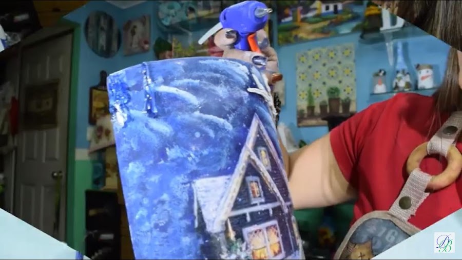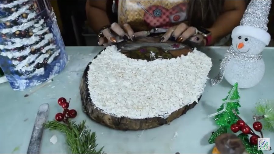 Usaremos una rodaja de madera, donde le pondremos nieve con goma blanca o cola de carpintero, dejando libre el espacio para pegar la teja, tal como vemos en la imagen
