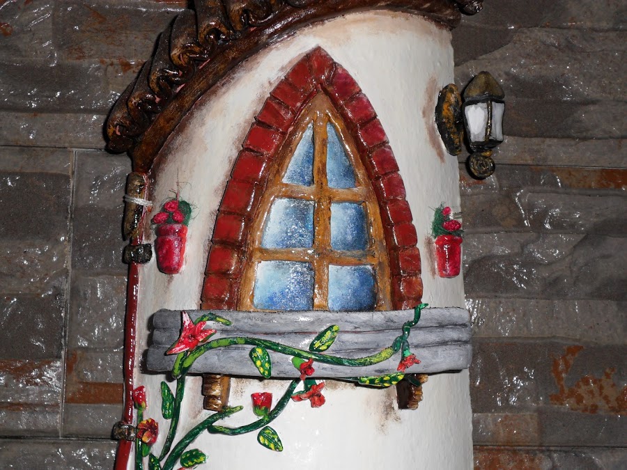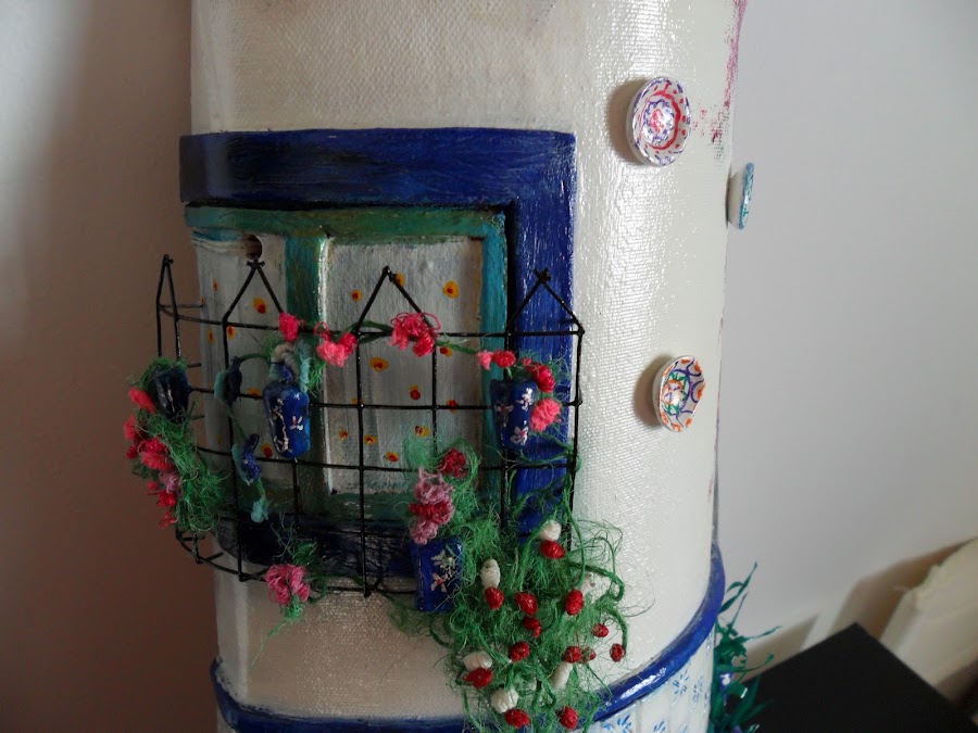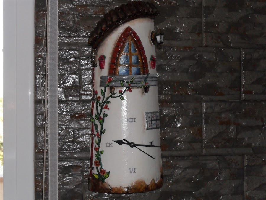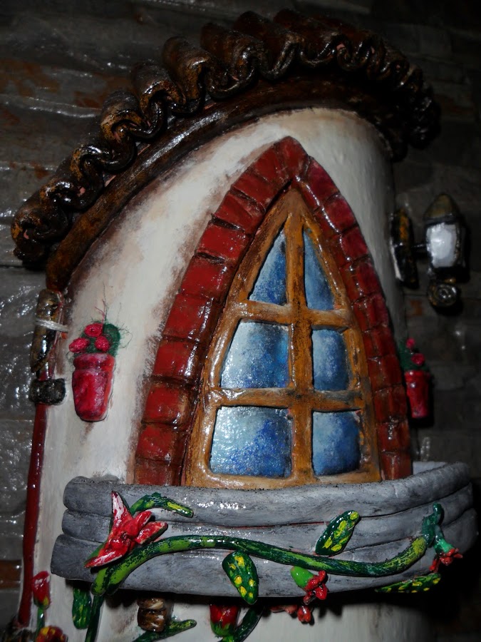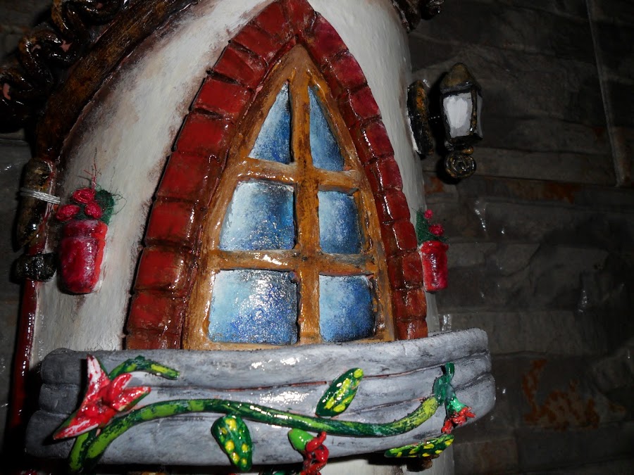 Realizada con pasta de modelar, flores secas y algún detalle en miniatura, como por ejemplo el farolillo de la puerta, la gaviota y el nido de sus polluelos, también puse un farolillo en la fachada en la que el globo es una canica. Esta teja decorada es la primera que hice, como no tenía mucha idea empecé a medir por unos patrones de cartón que fui recortando, las tejas también las hice a mano. Es ...