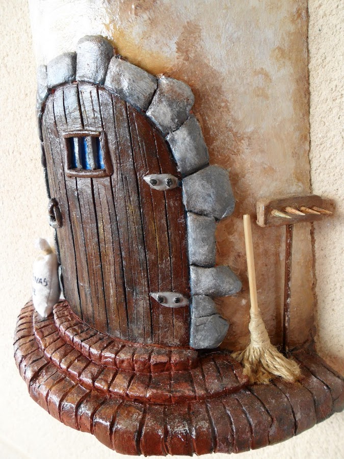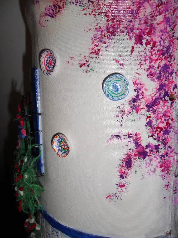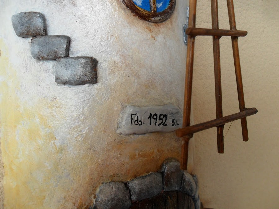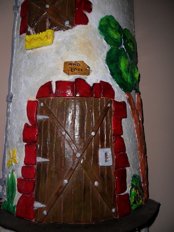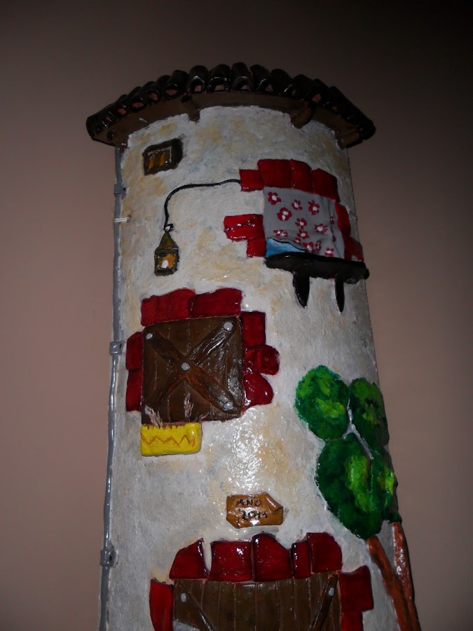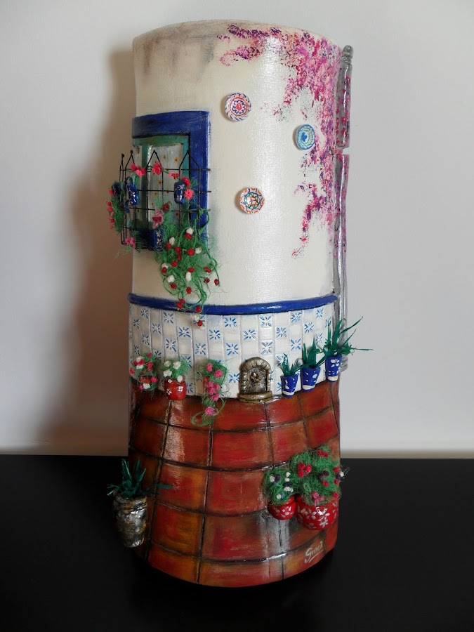 Realizada con pasta de modelar, flores secas y algún detalle en miniatura, como por ejemplo el farolillo de la puerta, la gaviota y el nido de sus polluelos, también puse un farolillo en la fachada en la que el globo es una canica. Esta teja decorada es la primera que hice, como no tenía mucha idea empecé a medir por unos patrones de cartón que fui recortando, las tejas también las hice a mano. Es ...