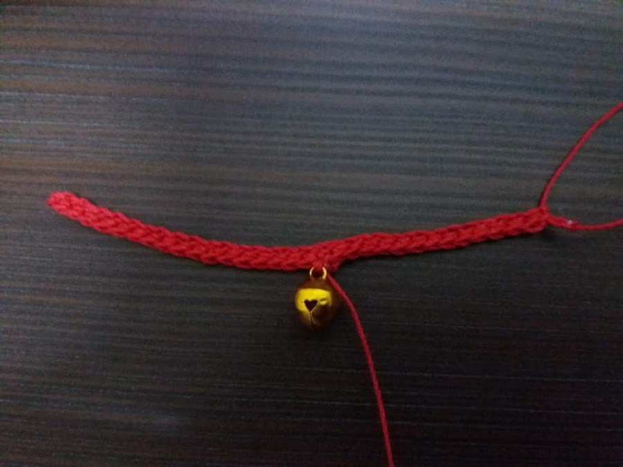 *POR ÚLTIMO AL COLLAR LE COSEMOS UN CASCABEL (DEL COLOR Y TAMAÑO QUE GUSTEN) COLOCAMOS LA TIRA AL REDEDOR DEL CUELLO Y COSEMOS LAS PUNTAS POR DETRÁS