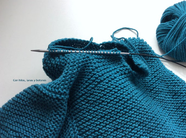 Tejemos a punto bobo los 13 puntos del otro hombro durante 8 vueltas y en ese momento añadimos 9 puntos y seguimos tejiendo a punto bobo. Ahora ya tenemos el hombro y la parte del delantero que lleva la abertura del escote.