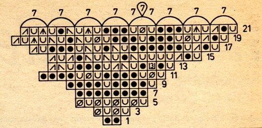 Levantar 8p. y repartir en 4 agujas ( 2p. por aguja), y seguir el diagrama. En las vueltas intermedias los p. y lazadas se tejen al derecho. En la vuelta 16º trabajar las 4 lazadas ( que están una al lado de la otra), 6 puntos, alternando 1 p. der., 1 p. rev. Después de la v. 22º cerrar los p. con p. bajo intercalando 7 cadenetas.