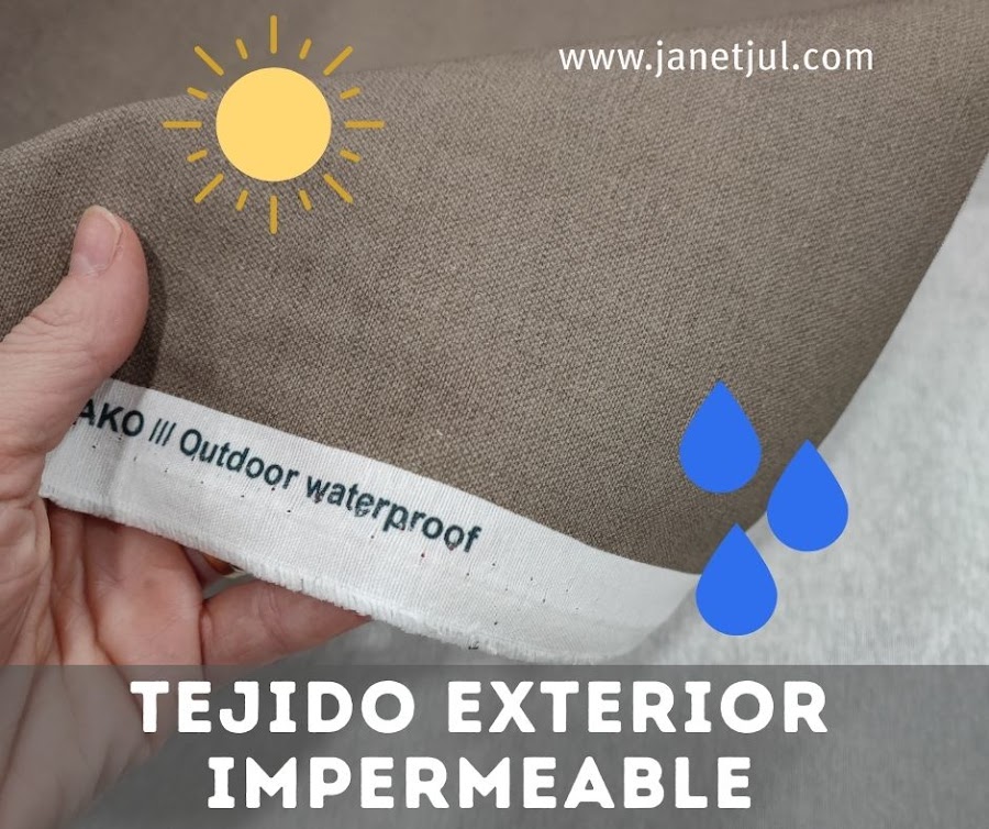 En un par de tardes realicé los cojines para los palets y la funda del puf. Es más sencillo de lo que parece, yo he realizado el cojín interior con tejido TNT y luego lo cubro con la funda realizada con este tejido para exterior impermeable. Como relleno he utilizado trozos de espuma.