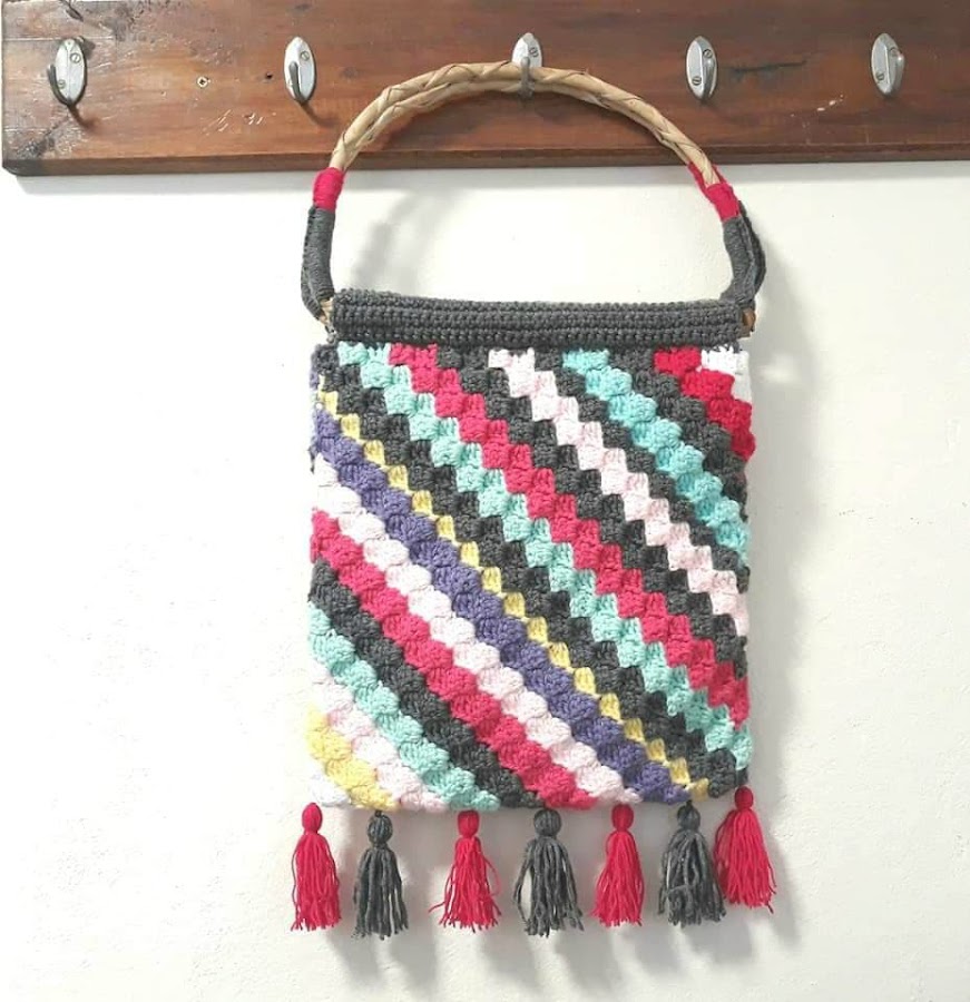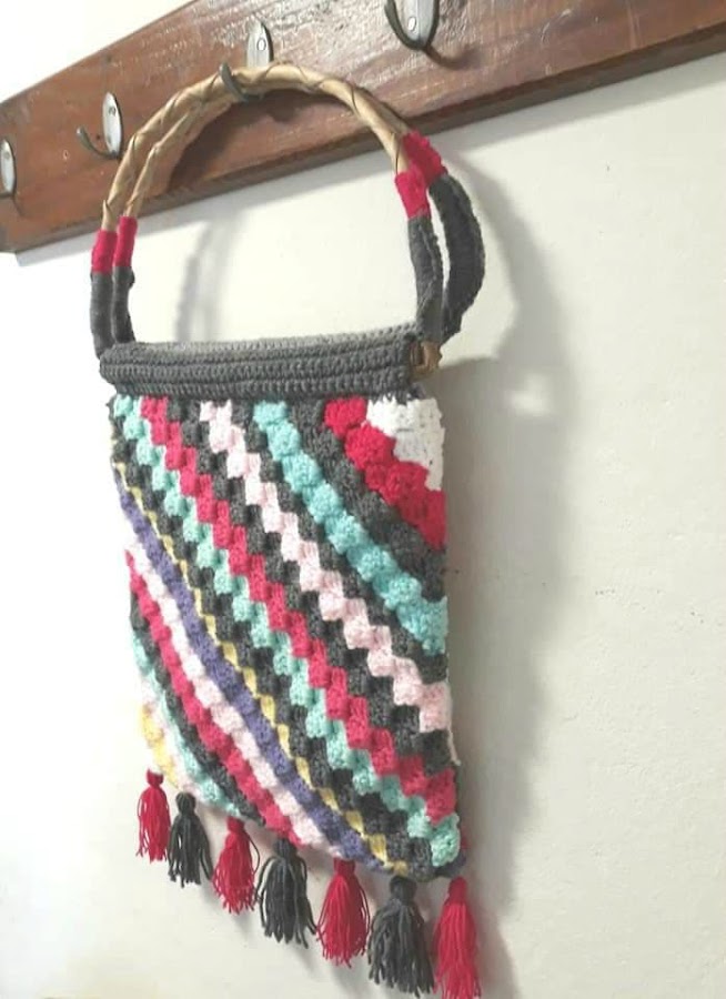Usé cuanto resto de lana que tenía sin pensar mucho la combinación de colores, y al final le agregué unas borlas,por si era poco tanto colorinche ¿viste?