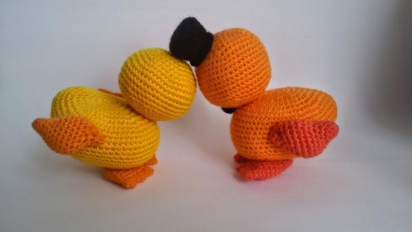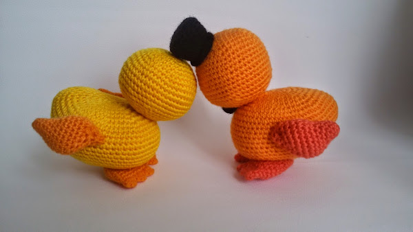 Decir que el pato naranja ha sido realizado por mi madre mientras que la patita amarilla y los complementos del patito naranja los he realizado yo :) En el caso de la pata, la cabeza tuve que disminuirla en dos filas, debido a que no me dio la lana :( aunque ha quedado muy simpática de todas formas.
