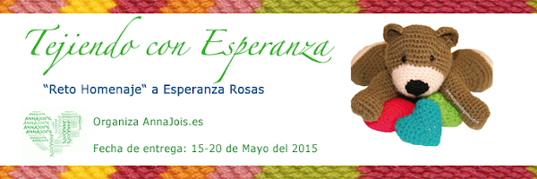 * El día 15 de mayo del 2015 se ha de publicar una entrada cuyo título o parte del mismo sea "Tejiendo con Esperanza", es decir, si hacemos un osito a ganchillo por ejemplo podríamos poner de título "Tejiendo con Esperanza ? Amigurumi Osito"