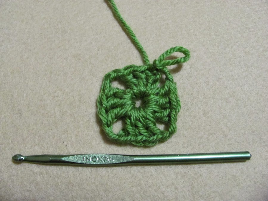 2.- Primera vuelta: tejer 3 cadenas, 2 puntos altos, 2 cadenas, 3 puntos altos, 2 cadenas. Continuar la vuelta hasta completar 4 motivos de 3 puntos altos cada uno y cerrar con punto deslizado. Ver la imagen de la izquierda. Los puntos altos van clavados por el centro del anillo.
