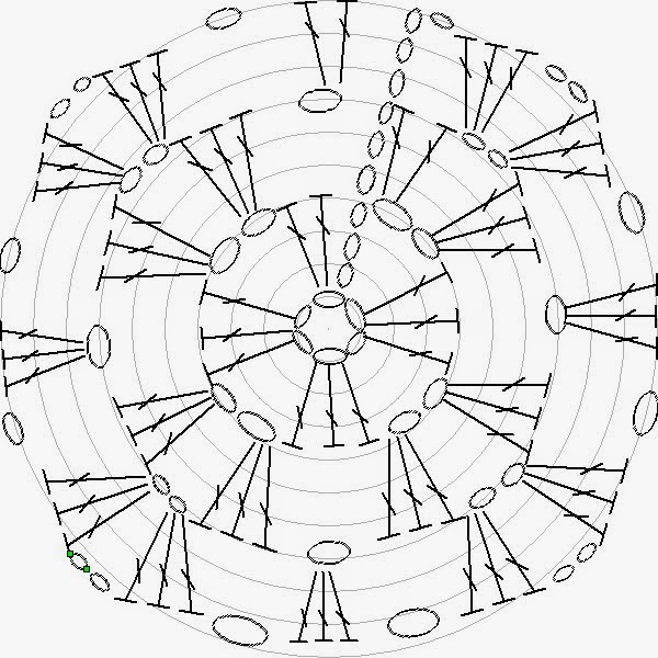 4.- Guiándose por el gráfico que se muestra a la izquierda, seguir realizando cuantas vueltas sean necesarias, tomando en cuenta que en las esquinas irán 2 cadenas entre cada motivo de 3 puntos altos, mientras que en los costados irá solo 1 cadena entre cada motivo.