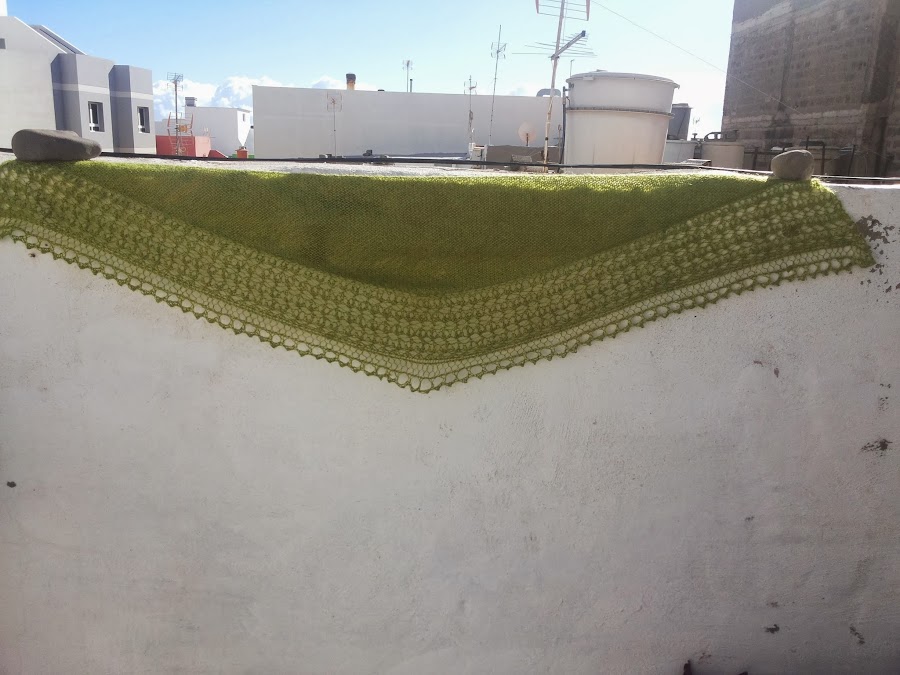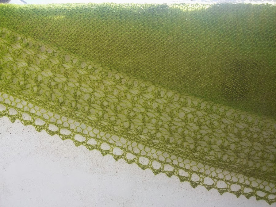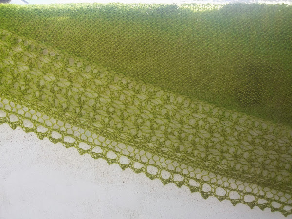Éste lo tejí con una maravillosa lana danesa llamada Canard.Es una mezcla de mohair con seda, de un bellísimo color verde. Quedó algo más pequeño que el anterior. Y si, también me quedé corta de lana. Pero mi amiga Lisa vino al rescate con un pequeño reto de la misma lana en la misma tintada. Tengo suerte de estar rodeada de tan buenas amigas.