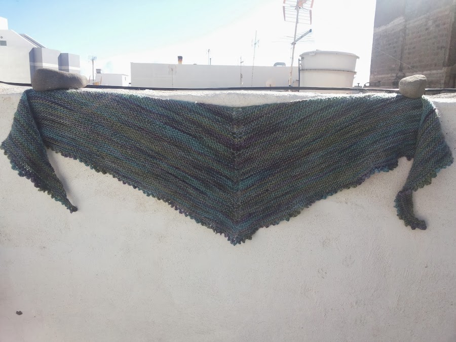 Éste lo empecé por casualidad, y lo terminé como me dió la gana. Es el patrón 22,5 degrees de Martina Behm. Usé una lana teñida a mano que me trajeron de Argentina hace unos años. Los colores son preciosos, pero su trama irregular me echaba un poco para atrás. Este patrón es perfecto para aprovechar ese tipo de lanas. Decidí terminarlo con un borde en picot porque para mi gusto quedaba más elegante, y porque la trama desigual deslucía un poco el borde original de la pieza.