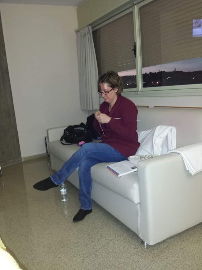 En la habitación de un hospital. Los días son muy largos y tejer ayuda en este tipo de lugares.