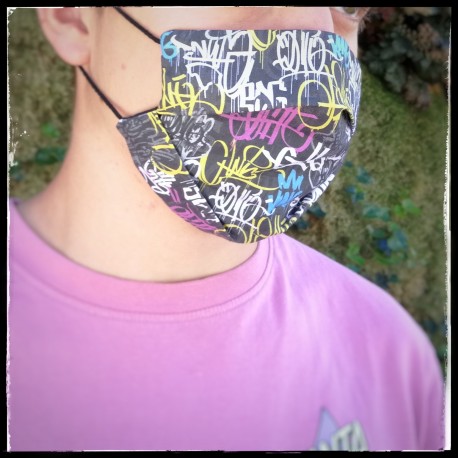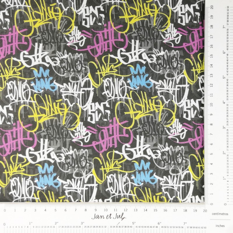 Esta maravillosa tela es de algodón 100%, tiene un ancho de 140 cm. con dibujos de graffiti en diferentes colores, un acierto seguro!