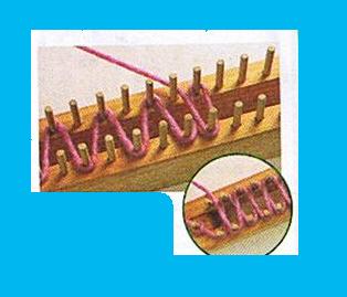 Tal como lo muestra el gráfico, el hilado se pasa alrededor de los clavos con movimientos de "ocho". Una de las diferencias con la forma anteriormente explicada, es que en este caso, no dejamos clavos libres sino que tejemos todos. Y la otra diferencia es que, mientras en el modo anterior, para tener una vuelta completa (todos los clavos con lazada), había que" ir y venir", en este con "ir" solamente ya completamos una vuelta.