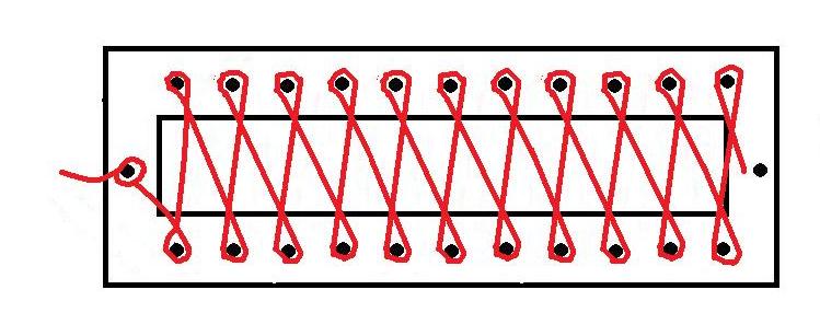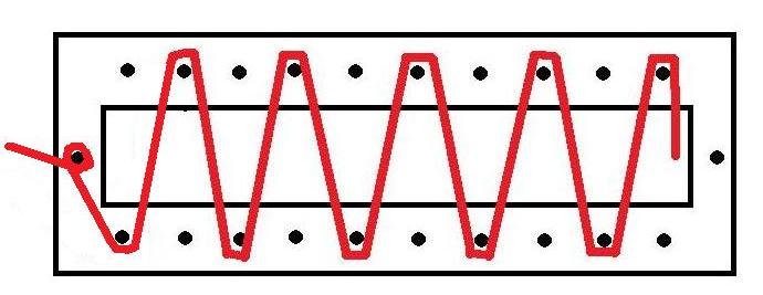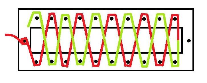 1- Del modo en que lo muestra el gráfico anterior, iremos pasando el hilado en forma de zig zag, salteando un clavo de cada lado.Una vez que llegamos al otro extremo (o hasta donde deseemos tejer), daremos la vuelta y volveremos haciendo lo mismo que en el paso anterior, pero pasando el hilado por los clavos que nos quedaron vacíos. Nota: el hilado es el mismo, no debemos cambiarlo. En el dibujo se muestra en distinto color para diferenciar las pasadas de ida y de vuelta.