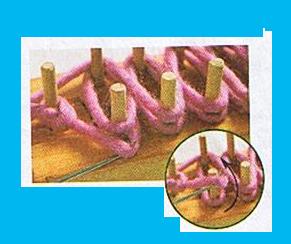 3- En este momento tenemos dos lazadas en cada clavo. Tomaremos entonces la aguja de crochet y comenzando desde el extremo inicial, iremos tomando la lazada inferior y pasando sobre la superior, la sacaremos del clavo. Realizaremos lo mismo en todos los clavos.