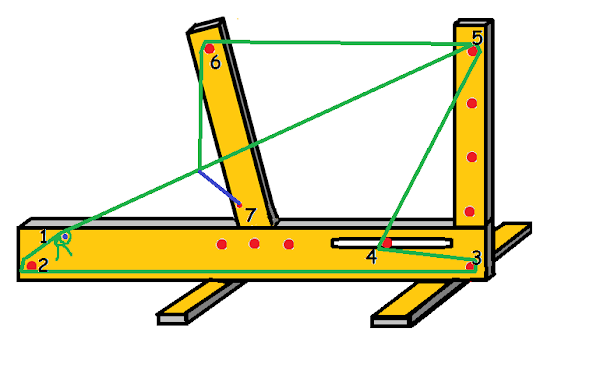 Son necesarios 11 pines de 20 cm por 1,5 o 2 cm de diámetro. Y 2 pines más: 1 de 20 cm por 1 cm de diámetro y otro de 16 cm por 1 cm de diámetro (punto azul en el gráfico).
