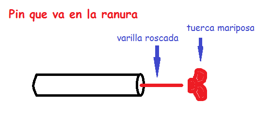 Uno de los pines gruesos llevará insertada en uno de sus extremos una varilla roscada de aproximadamente 10 cm de largo, la cual se ajustará con una tuerca mariposa que coincida con la rosca de la varilla. Este es el pin que pasa a través de la ranura y nos servirá para darle tensión al trabajo que estemos realizando.