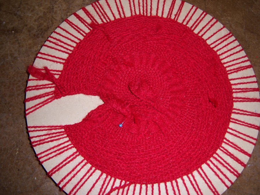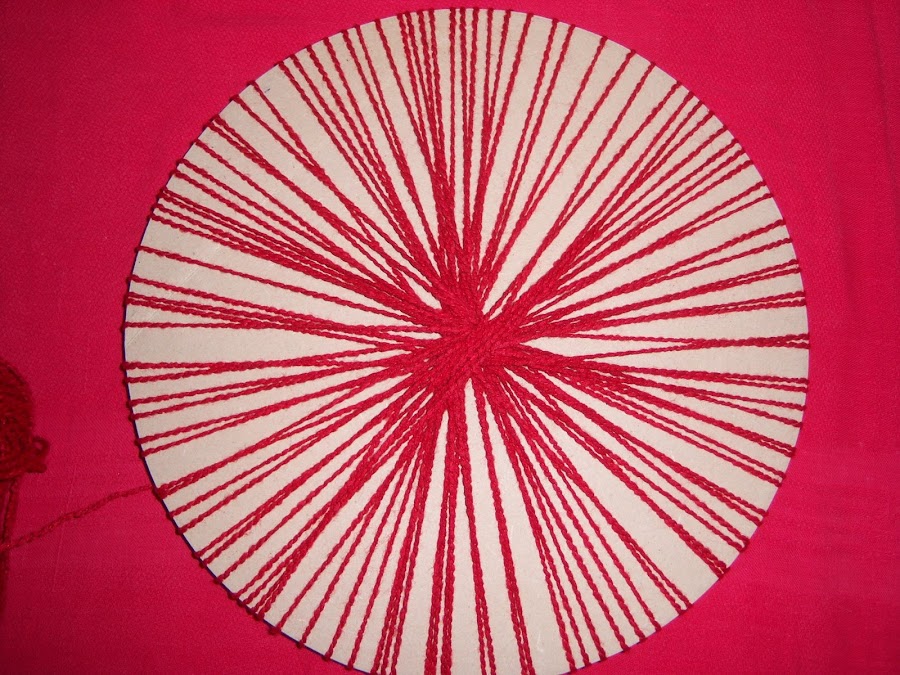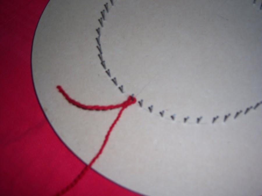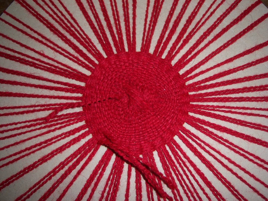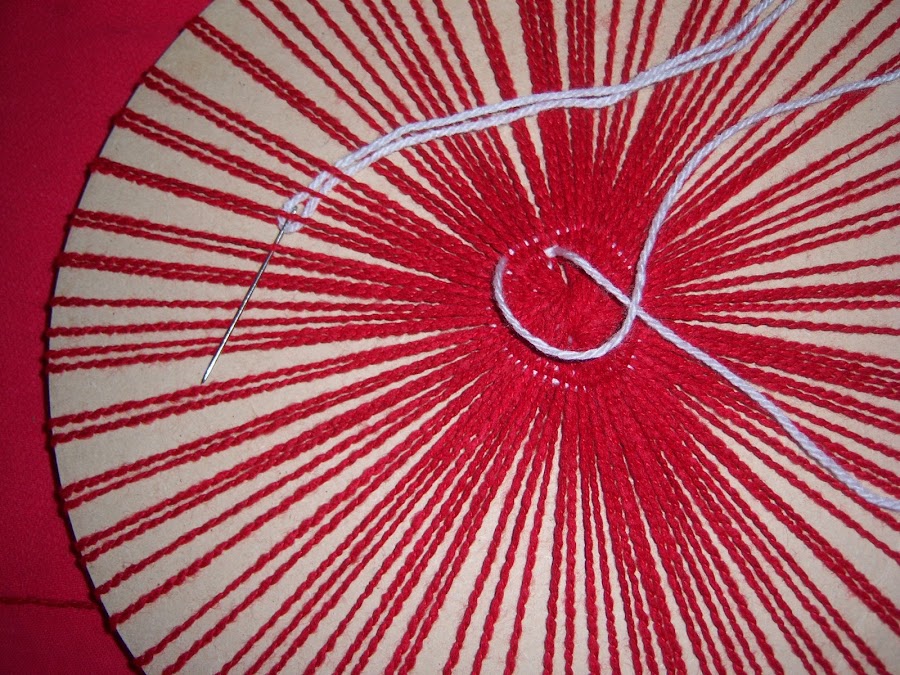 Con la aguja enhebrada iremos tomando un "rayo" por arriba y otro por debajo. Repetiremos este procedimiento hasta completar por lo menos unas 10 vueltas, siempre en el mismo sentido y en forma de espiral. Poner atención en que el rayo que en una vuelta tomamos por debajo, en la vuelta siguiente debe tomarse por arriba y viceversa.