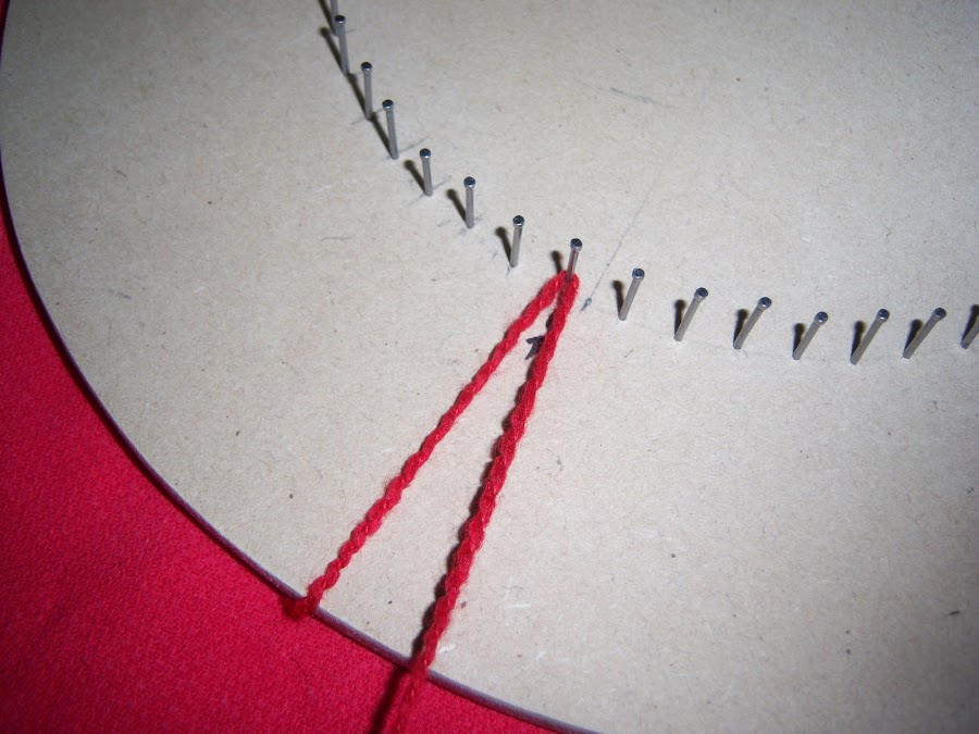 Introducimos la aguja de crochet en el punto del clavo de uno de los extremos (donde está la abertura) y sacamos una lazada. Introducimos nuevamente la aguja en el clavo contiguo, tomamos otra lazada de la lana suplementaria y luego cerramos las dos lazadas juntas. Repetimos con el clavo siguiente y con el resto.