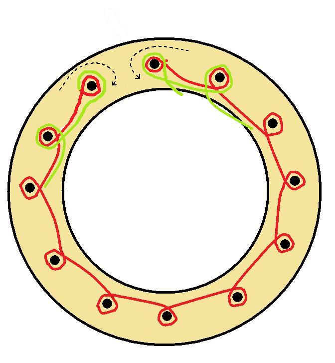 Las imágenes que vemos a continuación, muestran en rojo la primera vuelta y en verde el comienzo de la segunda. La lana es la misma, la utilización de dos colores tiene como finalidad mostrar con claridad dónde termina una vuelta y comienza la siguiente.