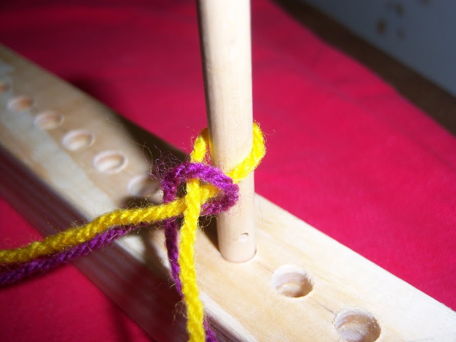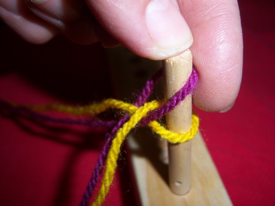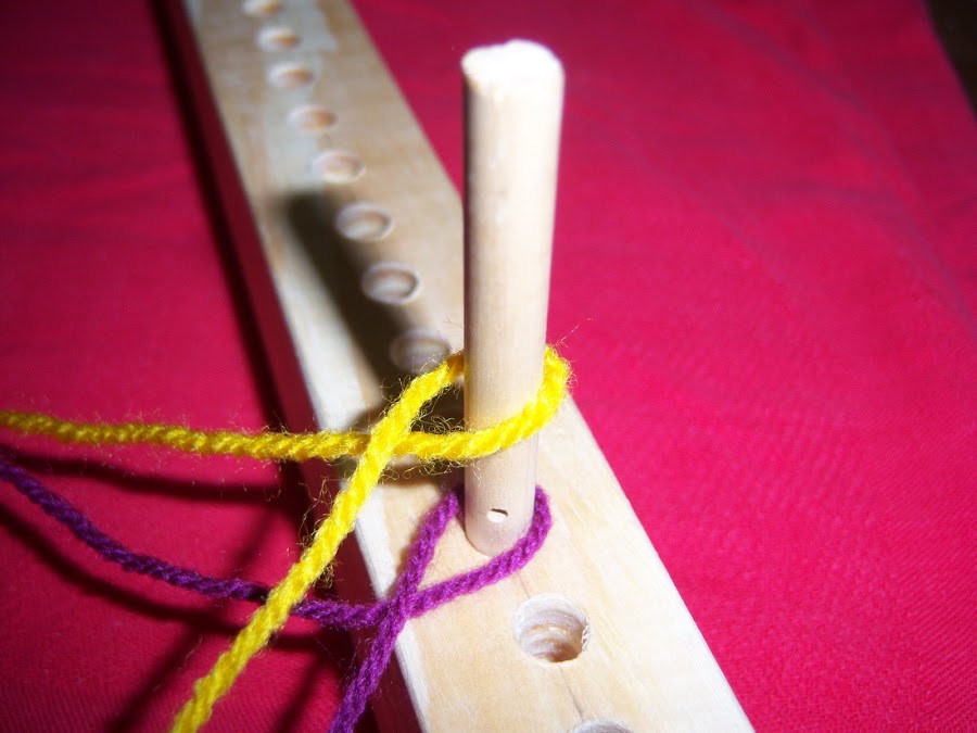 Para comenzar, anudamos la lana en cualquiera de los clavos, al cual sería conveniente identificarlo con una marca para saber dónde comienza y termina cada vuelta.