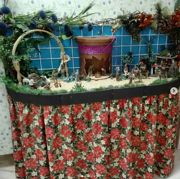 Me encanta el Nacimiento temático, con una bobina de hilo como pesebre, un aro de bastidor en la Anunciación y planchas antiguas entre algunos otros objetos de costura.