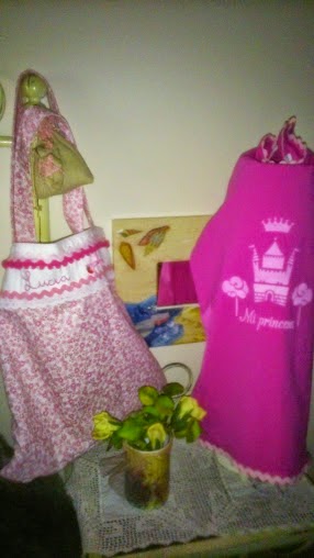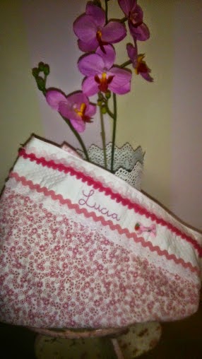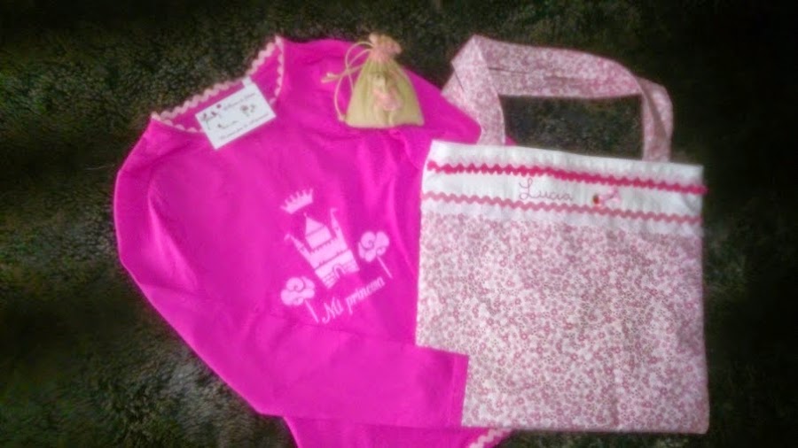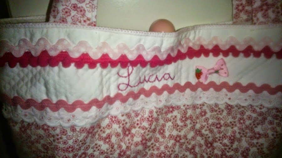 La tela la quería de lunares , pero como siempre se la hago de lunares, decidí por una de flores y le añadí una blanca de piqué, para así poderle grabar el nombre.