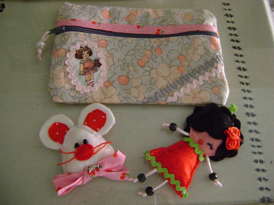 aki os muestro una bolsita q a mi me encanta con esa muñequita, y unos broches de fieltro ya q ahora estoy empezando tb con el fieltro.
