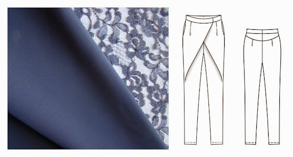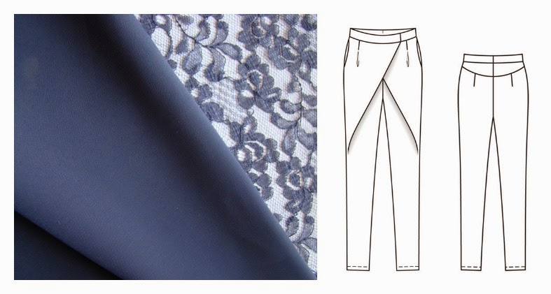 Esta combinación en azul marino, con la que empezaba, la entrada, que se trata de una tela muy ligera y fresca, con la que quiero hacer los pantalones que os adelantaba hace una semana y que si me sobra algo, combinaría con el encaje del fondo.