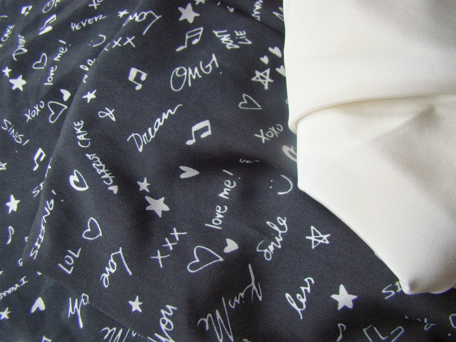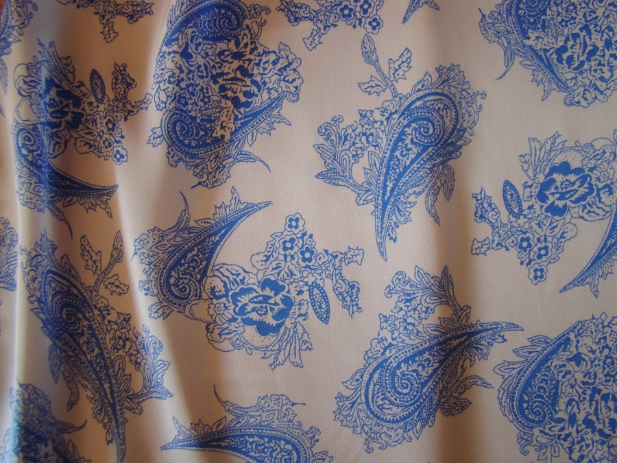 Aquí ha tomado un tono un poco raro por la foto, pero en realidad es de fondo blanco con estampado en azul Klein, en una tela de satén suave que queda muy bien.
