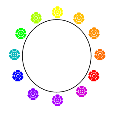 Esta que ves abajo sería una rueda de color básica. En ella he colocado los colores primarios (amarillo, azul y rojo), así como los secundarios y terciarios. Pero no sólo existen estos colores, hay tantos como posibles combinaciones de los mismos, las mezclas, que he preferido omitir para no liaros.