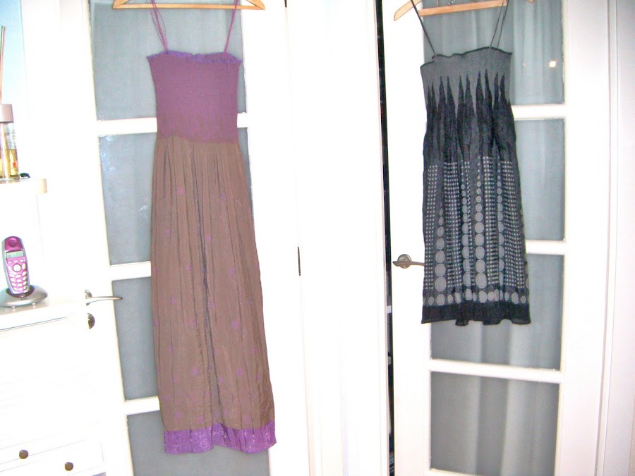 Los vestidos son de las telas que compre en Francia en el almacen que nos llevo Kuka. Son revesibles, alli no me di cuenta, pero por falta de dos han salido cuatrooooooo. Uno negro por un lado y gris por el otro. Lleva unos minitirantitos en negro y gris clarito,